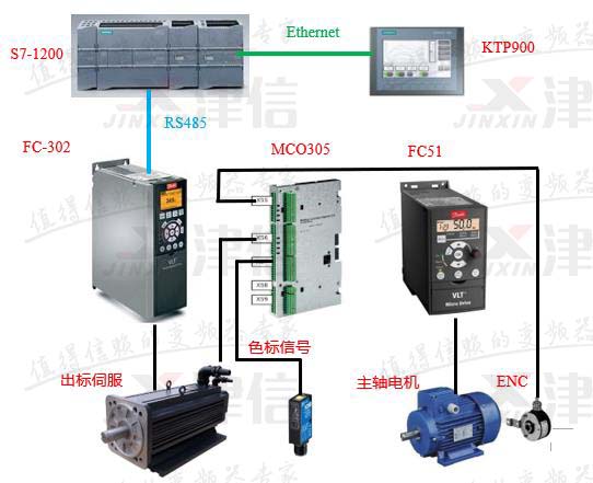 PLC與觸摸屏之間進行Ethernet通訊,PLC與丹佛斯FC302變頻器之間進行RS485通信,通過觸摸屏可以設(shè)置標(biāo)長、對標(biāo)位置、出標(biāo)起始位置等工藝參數(shù);FC302變頻器控制出標(biāo)伺服電機,以保證出標(biāo)精度及響應(yīng)精度。
