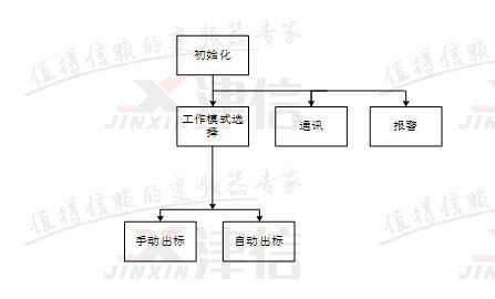 開機后,首先進行程序的初始化。初始化完成后同時調(diào)用工作模式選擇、報警和PLC與變頻器之間的通訊程序。工作模式中,包含手動出標(biāo)、自動出標(biāo)兩種狀態(tài)。報警程序用于對機器狀態(tài)進行實時監(jiān)控,并根據(jù)故障情況執(zhí)行相關(guān)動作。