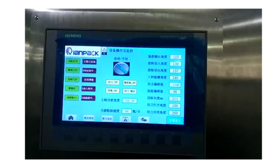 如圖中所示;設(shè)備采用了真空旋轉(zhuǎn)式標(biāo)盤,具有吸標(biāo)、傳輸、貼標(biāo)等多方面功能,同時涂膠輥與切刀輥負(fù)責(zé)標(biāo)簽的切斷與涂膠,并設(shè)有‘無瓶不出標(biāo)’和‘無標(biāo)不涂膠’功能,提高了貼標(biāo)效率與工作的可靠性。