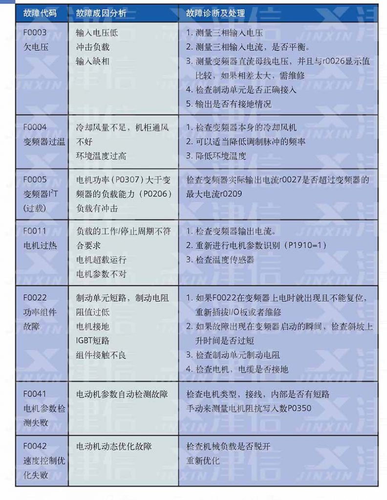 二、F0003欠電壓,F(xiàn)0004變頻器過(guò)溫,F(xiàn)0005變頻器過(guò)載,F(xiàn)0011電機(jī)過(guò)熱,F(xiàn)0022功率組件故障,F(xiàn)0041,F(xiàn)0042
