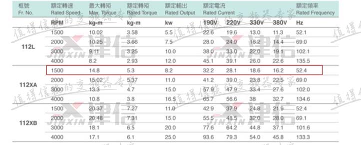 從FUKUTA異步伺服電機樣本中選出滿足條件的電機:SF-112XA 1500rpm/8.2kW,額定轉(zhuǎn)矩5.3kgm,大于40Nm/0.85(減速機效率)。電機380VAC時額定電流16.2A。